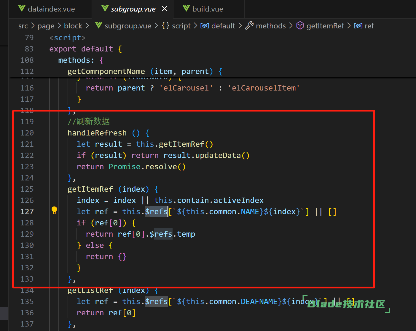 3. 在 subgroup.vue 中通过组件引用链 temp.vue → 动态组件 → common.js mixin 最终调用到这个方法