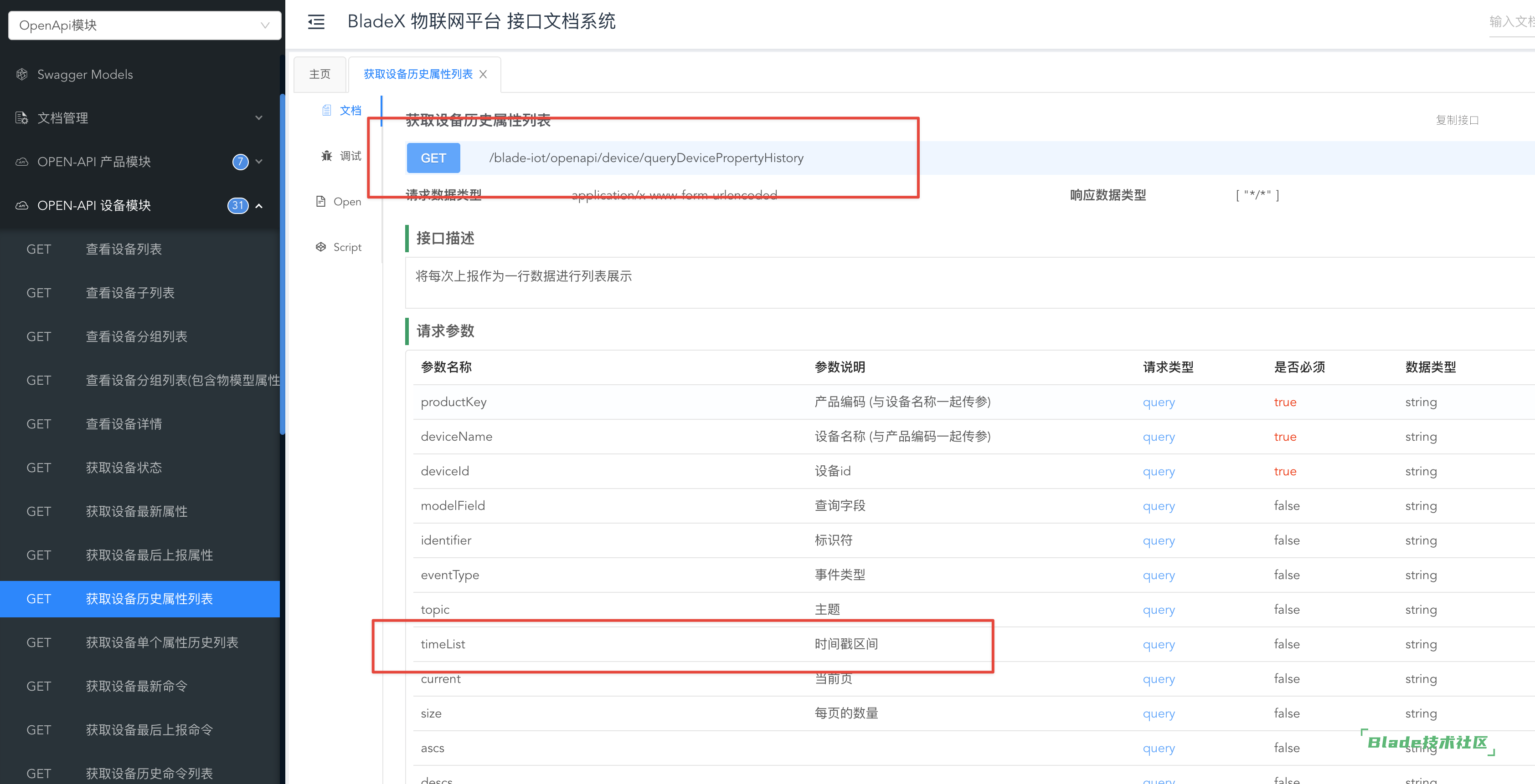 开放API可以看这里:https://openapi.javablade.com/doc.html#/OpenApi%E6%A8%A1%E5%9D%97/OPEN-API%20%E8%AE%BE%E5%A4%87%E6%A8%A1%E5%9D%97/queryDevicePropertyHistory