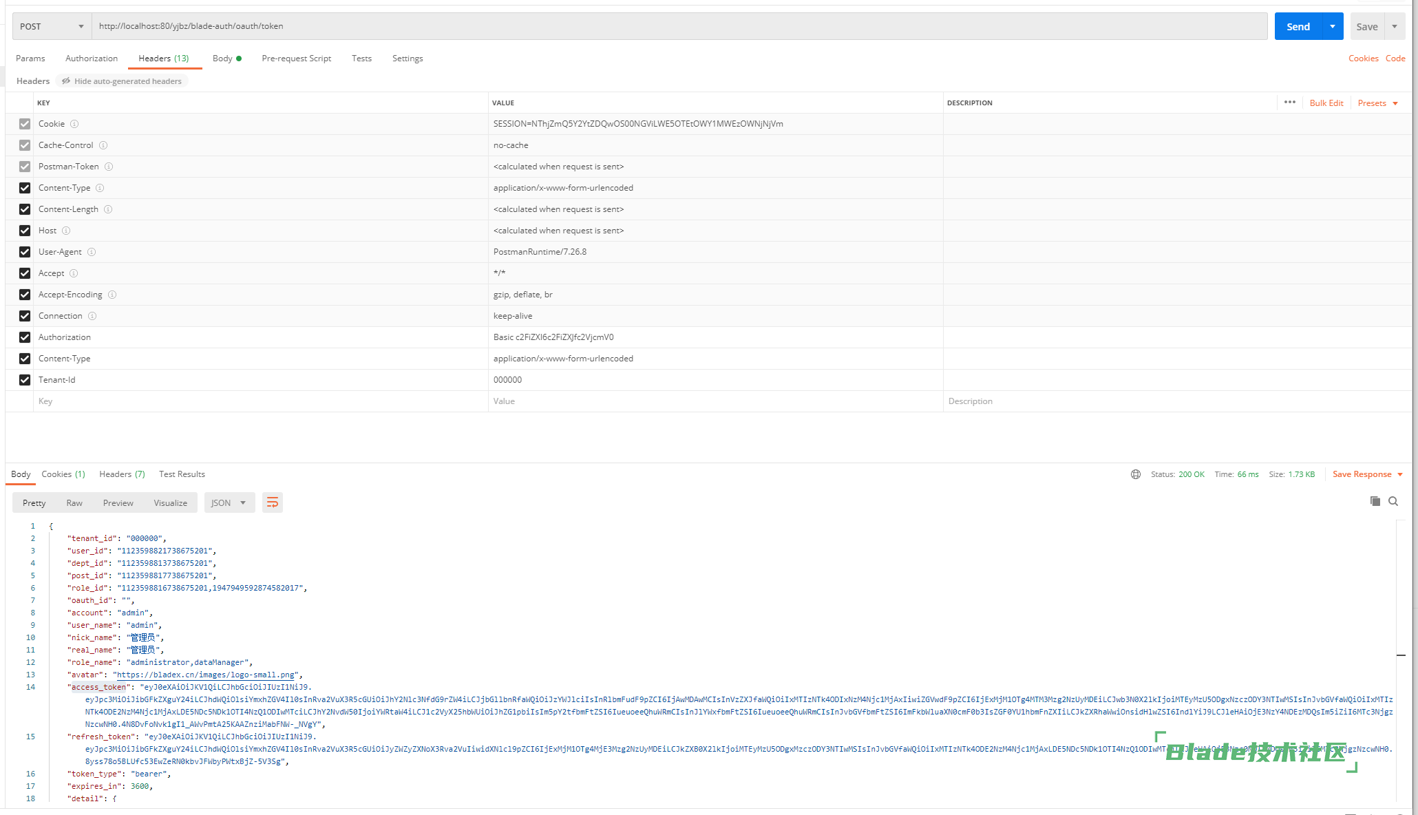 1. 本地执行http://localhost:80/yjbz/blade-auth/oauth/token,请求头Authorization为Basic c2FiZXI6c2FiZXJfc2VjcmV0,获取access_token成功
