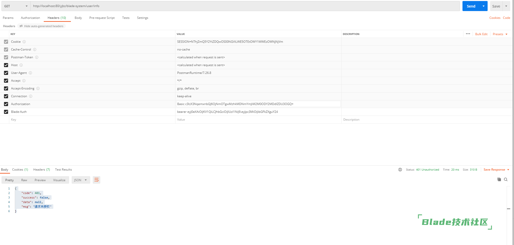 2. 本地postman执行接口http://localhost:80/yjbz/blade-system/user/info,已经将上一步的access_token放到请求头Blade-Auth中,同时Authorization为Basic c2FiZXI6c2FiZXJfc2VjcmV0,执行报未授权