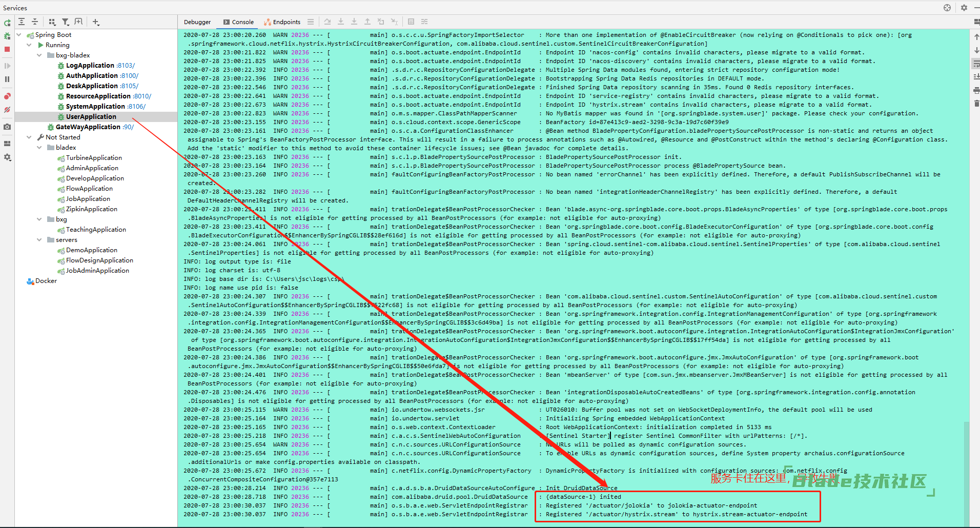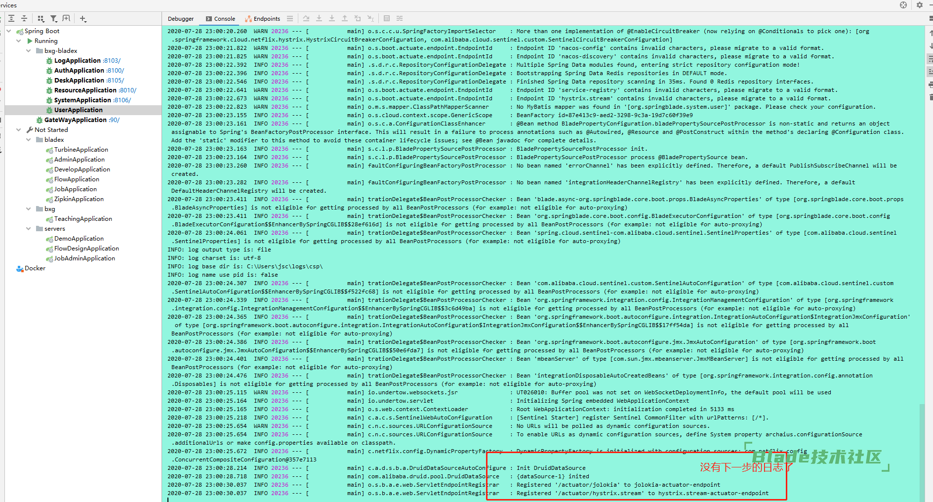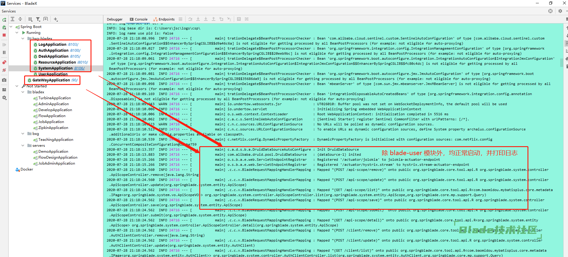 1.除blade-user外其它服务均正常启动,并打印日志。