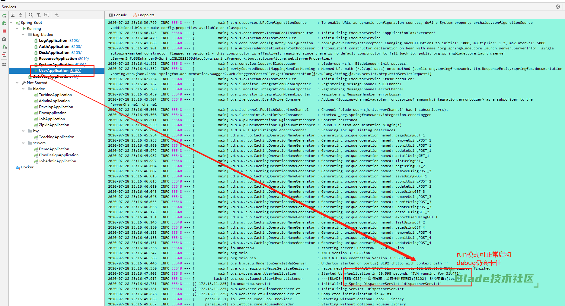 3改idea debug模式为 run模式运行blade-user时会正常启动,debug模式仍然会卡住。
